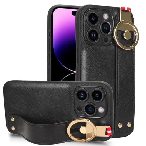 Funda para iPhone 14 Pro Max Wristband Leather Back Phone Case (Negro)