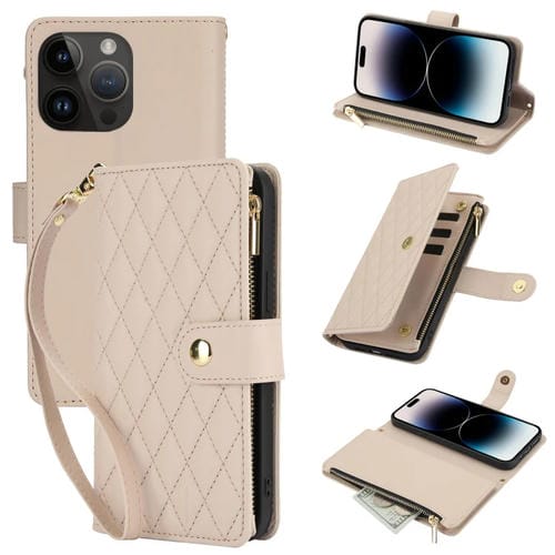 Funda de Cuero para Teléfono iPhone 14 Pro Ym016 Billetera Tarjeta Cremallera Rómbica Cordón (Albaricoque)