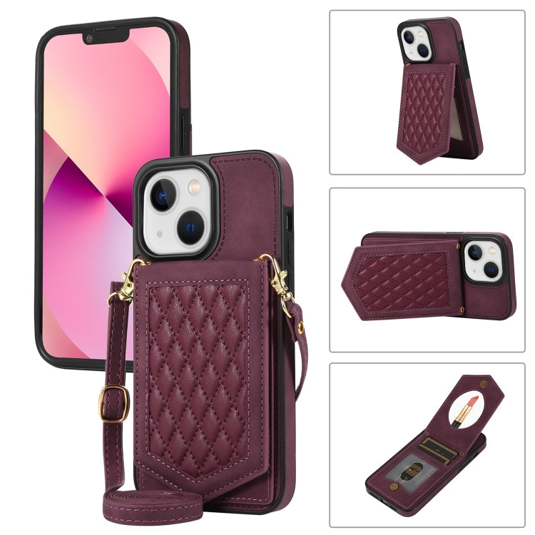 Funda para iPhone 14 Rhombic Texture Rfid con Cordón y Espejo (Rojo Vino)