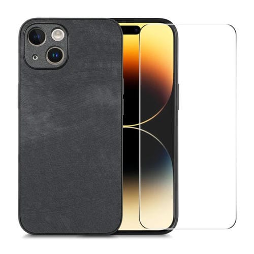 Funda para iPhone 15 Enkay Retro Leather Skin PC con Película de Vidrio Aluminio y Silicio (Negro)