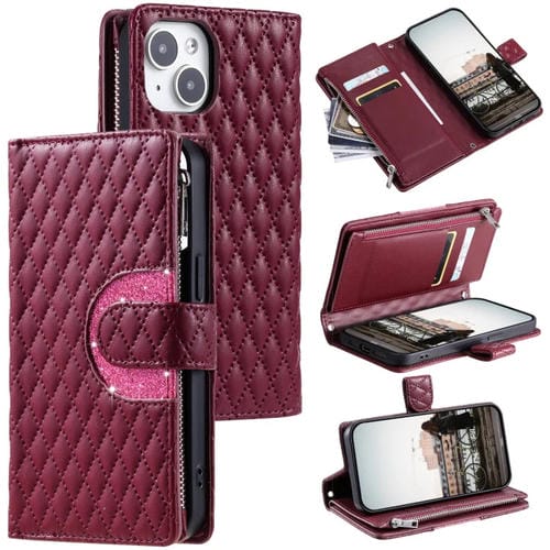 Estuche para teléfono iPhone 15 cuero con billetera cremallera celosía purpurina (Rojo Vino)