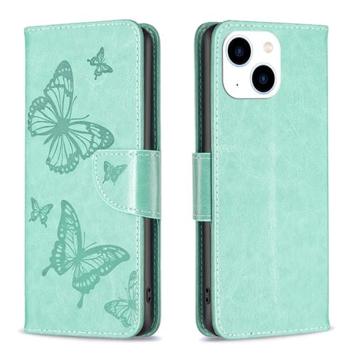 Estuche para teléfono iPhone 15 Cuero con patrón de dos mariposas en relieve (Verde)