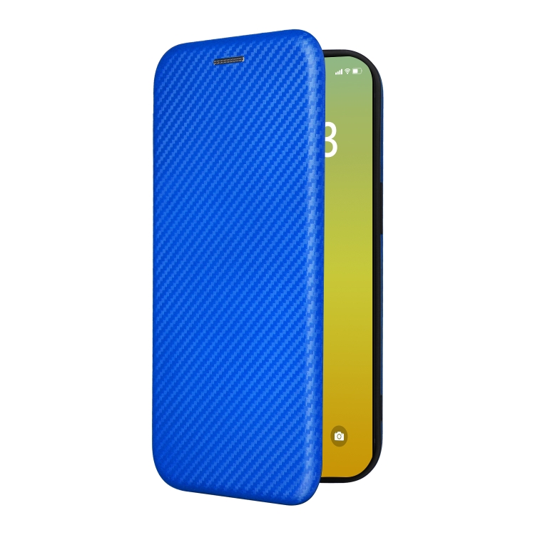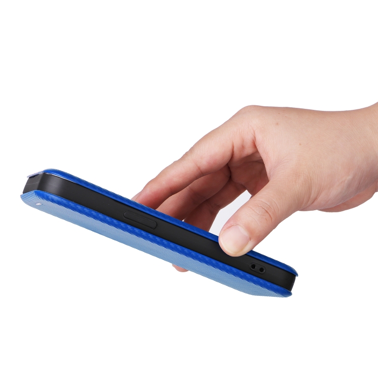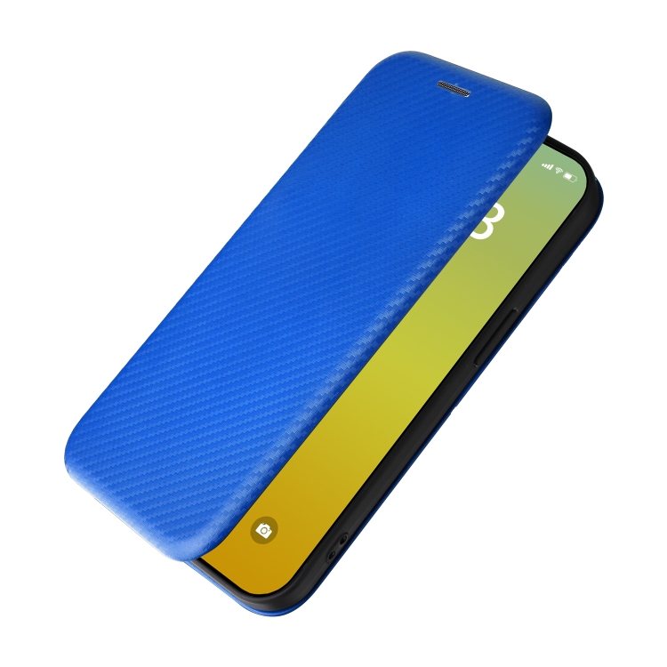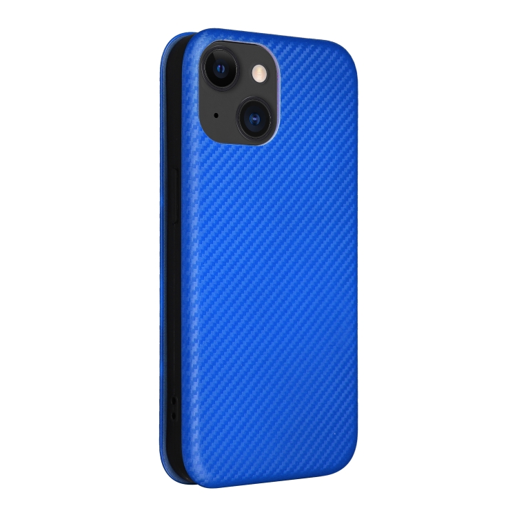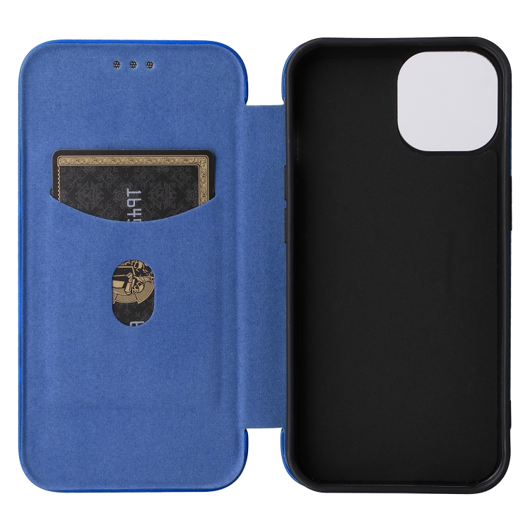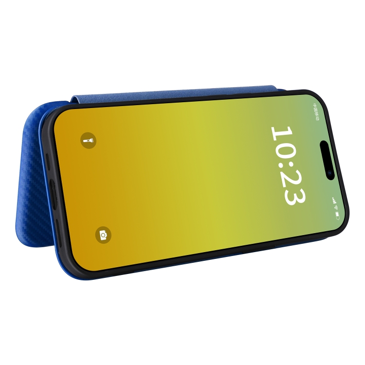 Funda de teléfono para iPhone 15 con tapa de cuero y textura de fibra de carbono (Azul)
