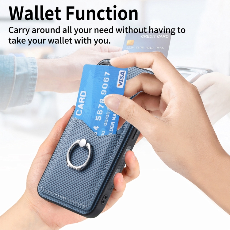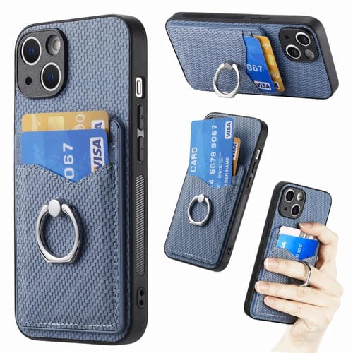 Funda para Teléfono para iPhone 15 con Soporte para Anillo y Billetera con Tarjeta Fibra de Carbono (Azul)