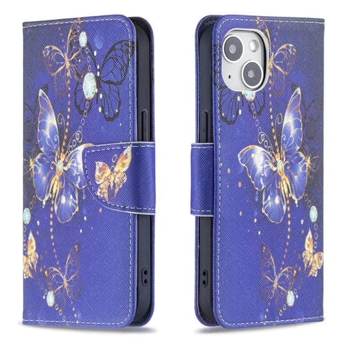 Funda de Cuero Flip para iPhone 15 Patrón de Dibujo Coloreado (Mariposa Púrpura)