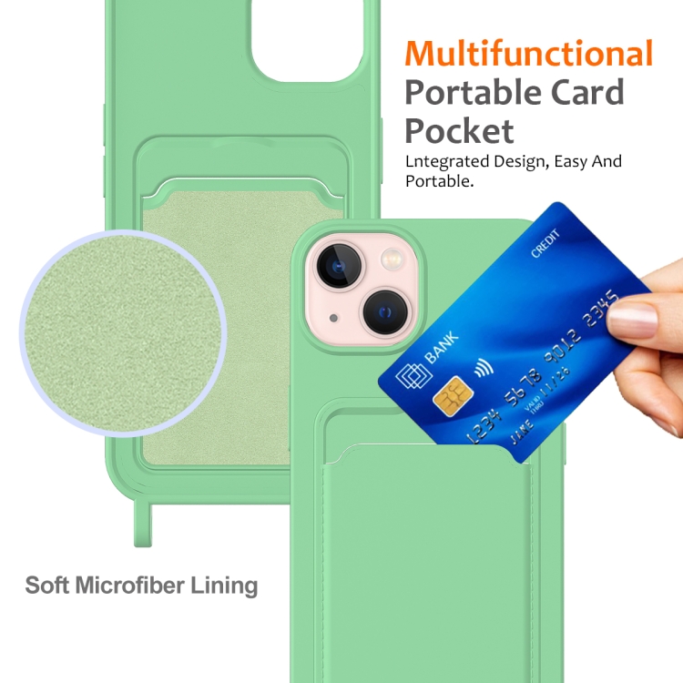 Funda para Teléfono iPhone 15 Plus Bolsa para Tarjeta Integrada Silicona Líquida con Cordón (Verde)
