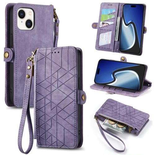 Estuche para teléfono iPhone 15 Plus Cuero con hebilla lateral y cremallera geométrica (Púrpura)