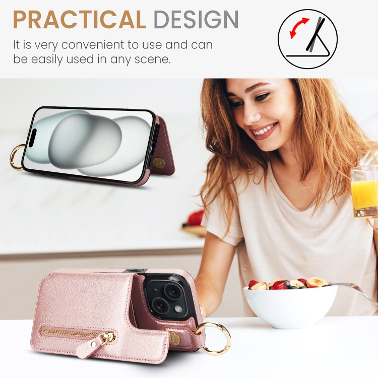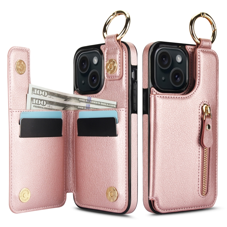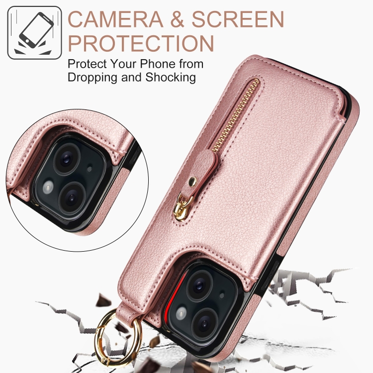 Funda para Teléfono iPhone 15 Plus con Bolsa para Tarjeta Doble Hebilla y Cremallera (Oro Rosa)