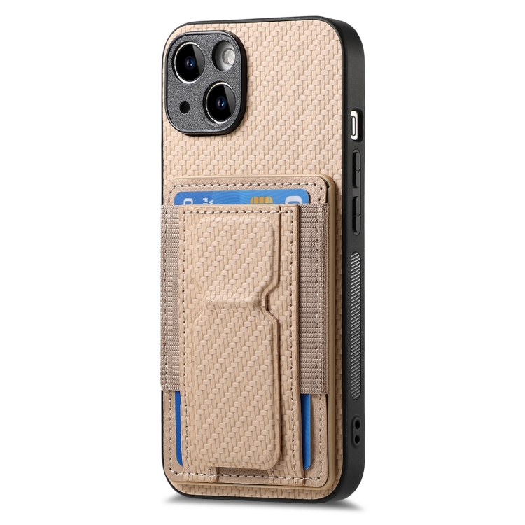 Funda para Teléfono iPhone 15 Plus con Bolsa para Tarjeta Elástica y Soporte Plegable de Fibra de Carbono (Caqui)
