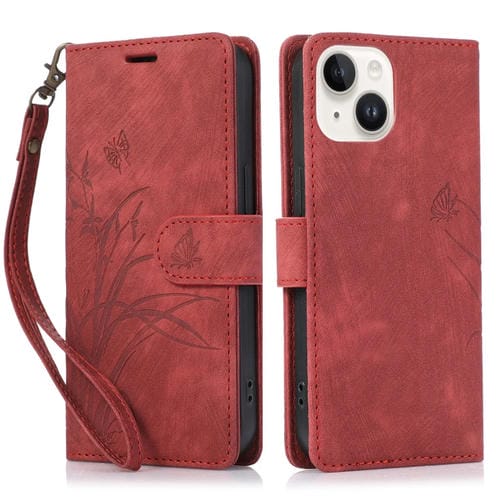 Funda para Teléfono iPhone 15 Plus Cuero con Relieve Mariposa Orquídea (Rojo)