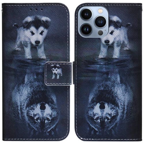 Estuche de Teléfono Cuero para iPhone 15 Pro con Tapa Dibujo Coloreado (Lobo y Perro)