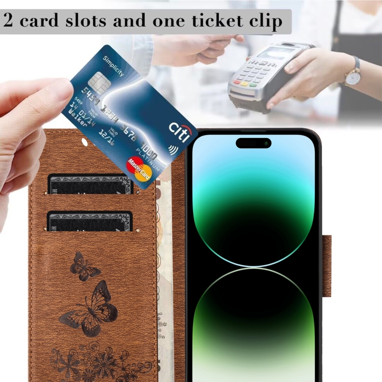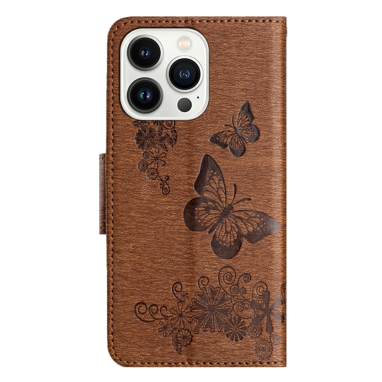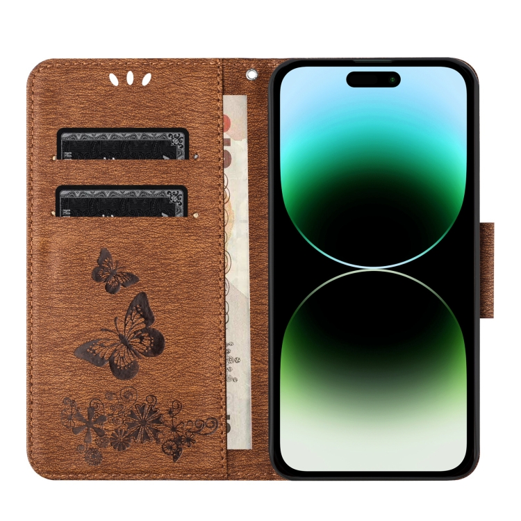 Funda de teléfono iPhone 15 Pro cuero con tapa en relieve de mariposa (Marrón)