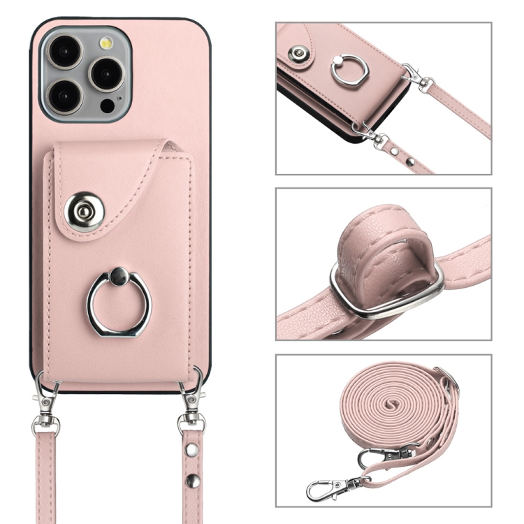 Funda para Teléfono iPhone 15 Pro con Soporte para Anillo y Bolsa para Tarjeta de Órgano con Cordón Largo (Rosa)