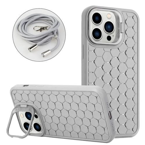 Funda para teléfono iPhone 15 Pro Honeycomb Radiating Holder TPU con cordón (Gris)