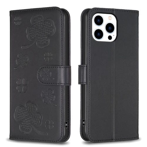 Funda para Teléfono iPhone 15 Pro Max Cuero Relieve Cuatro Hojas (Negro)