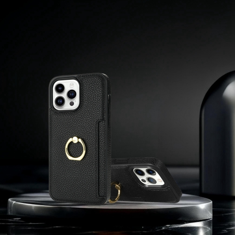 Funda Trasera para iPhone 15 Pro Max Ring Card Litchi de Cuero (Negro)