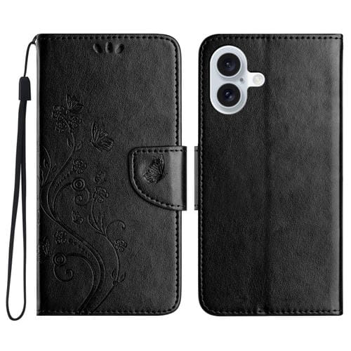 Funda para Teléfono iPhone 16 Plus Cuero con Tapa Patrón Flores Mariposa (Negro)