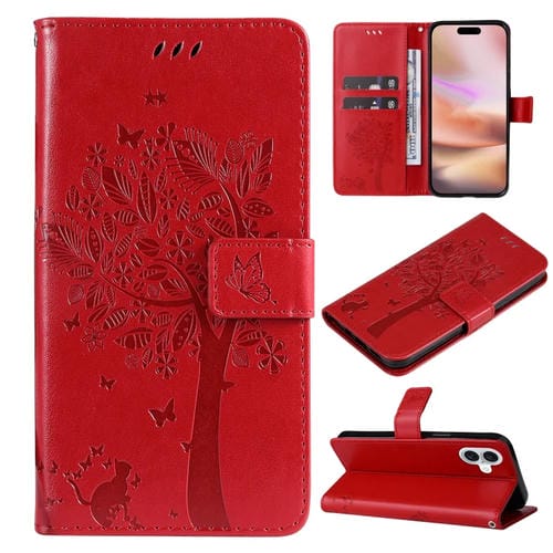 Funda para Teléfono iPhone 16 Plus Cuero con Tapa Patrón Árbol y Gato (Rojo)
