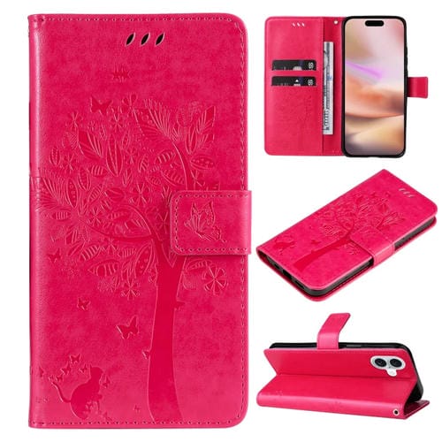 Funda para Teléfono iPhone 16 Plus Cuero con Tapa Patrón Relieve Árbol y Gato (Rojo Rosa)