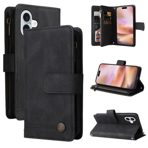 Funda para Teléfono iPhone 16 Plus Skin Feel Cuero Cremallera Billetera Múltiples Tarjetas (Negro)