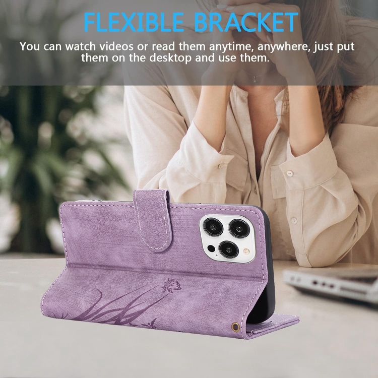 Funda para Teléfono iPhone 16 Pro Max Cuero con Relieve Mariposa Orquídea (Púrpura)