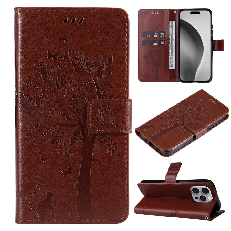 Funda para Teléfono iPhone 16 Pro Max Cuero con Tapa Patrón Árbol y Gato (Café)