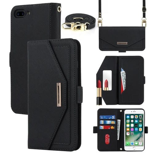 Funda para iPhone 8 Plus y 7 Plus Cross Texture Lanyard de Cuero (Negro)
