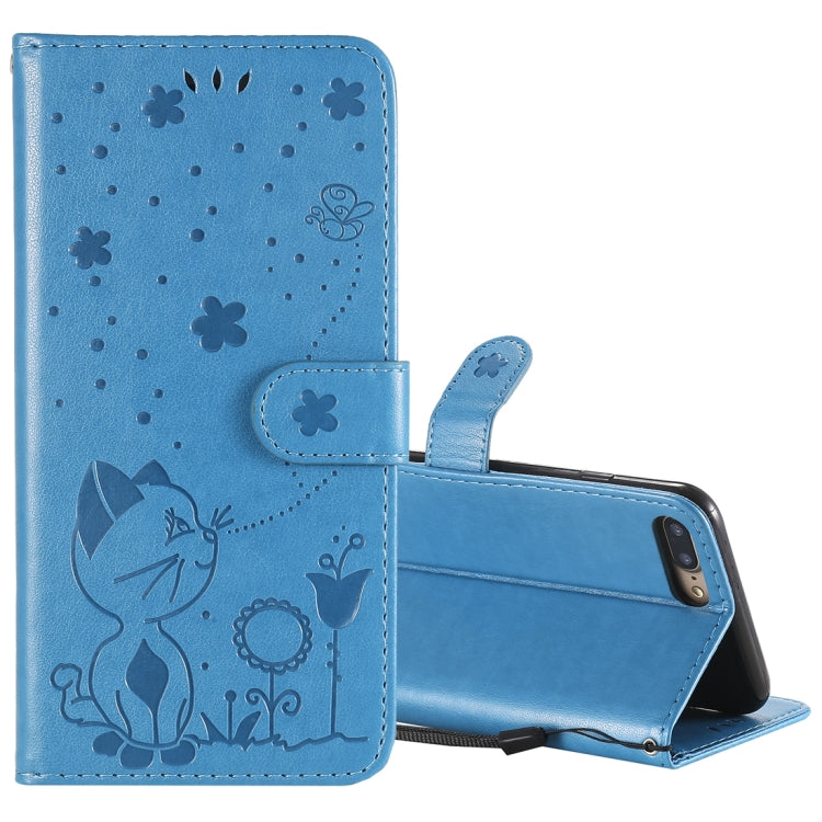 Funda de Cuero para iPhone 8 Plus y 7 Plus Patrón Abeja y Gato con Tapa Horizontal Soporte Ranuras y Billetera (Azul)