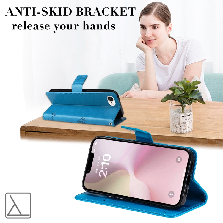 Funda de Cuero con Tapa para iPhone 16E con Diseño de Árbol y Gato En Relieve (Azul)
