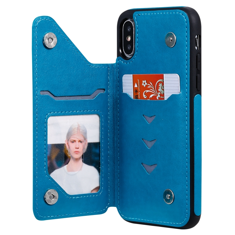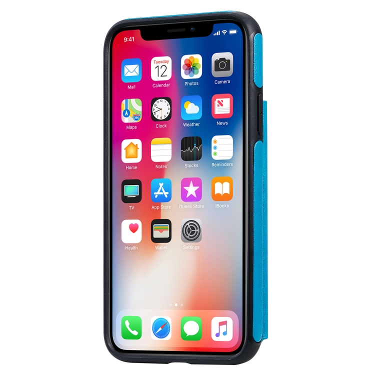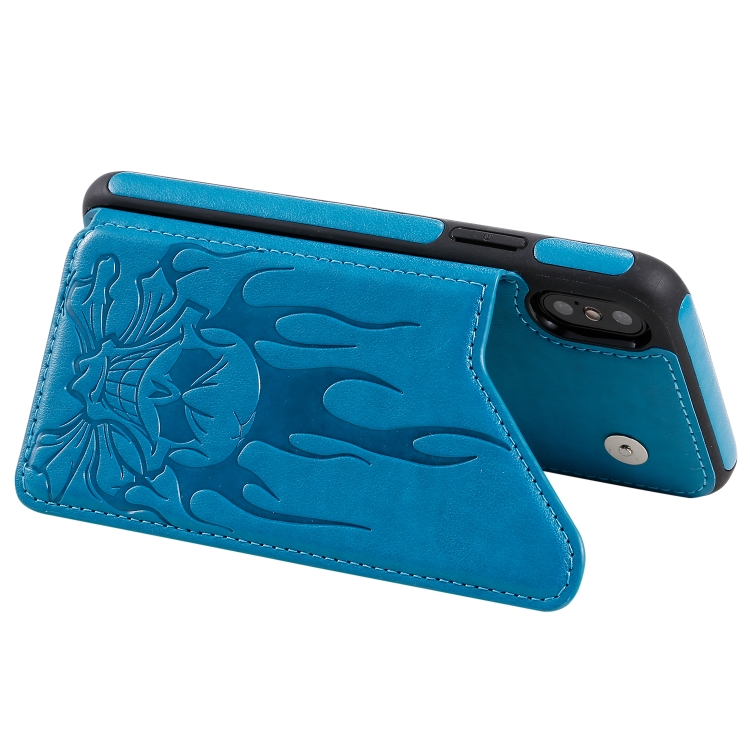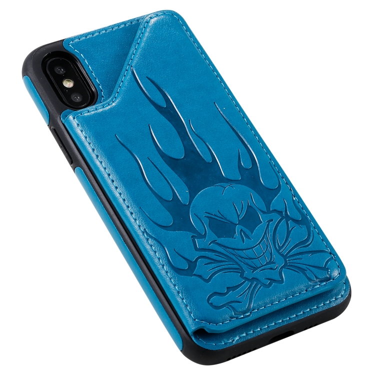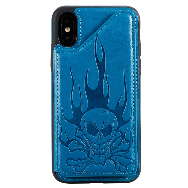 Estuche protector para iPhone X Xs Patrón Cabeza de Calavera con Soporte y Ranuras para Tarjetas y Billetera (Azul)