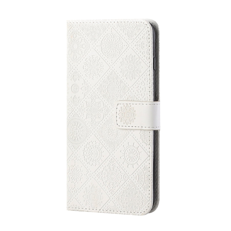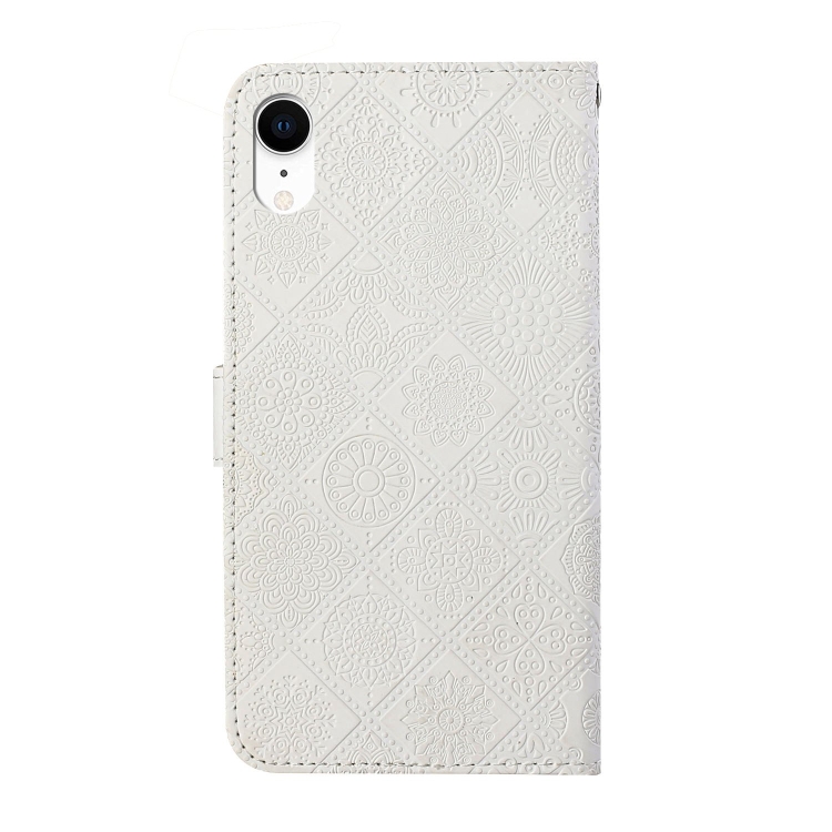 Estuche de Cuero para iPhone Xr con Tapa Horizontal Patrón Étnico Soporte Ranuras y Cordón (Blanco)