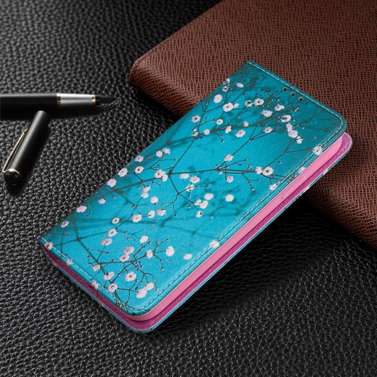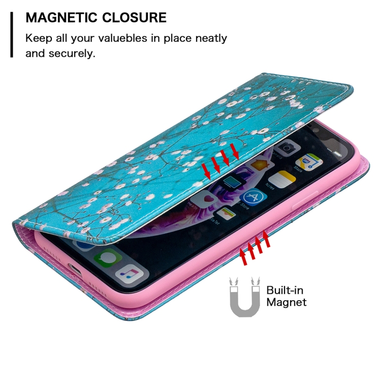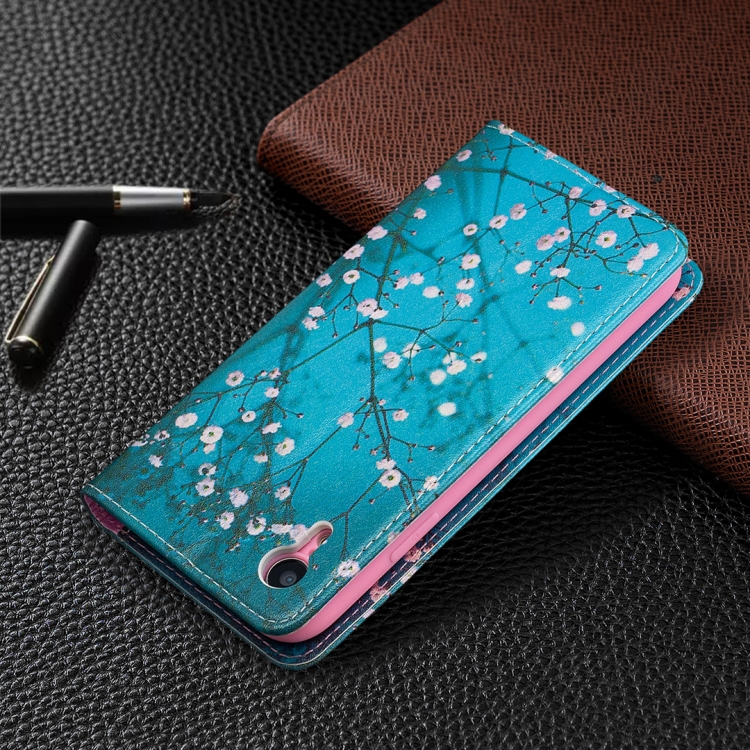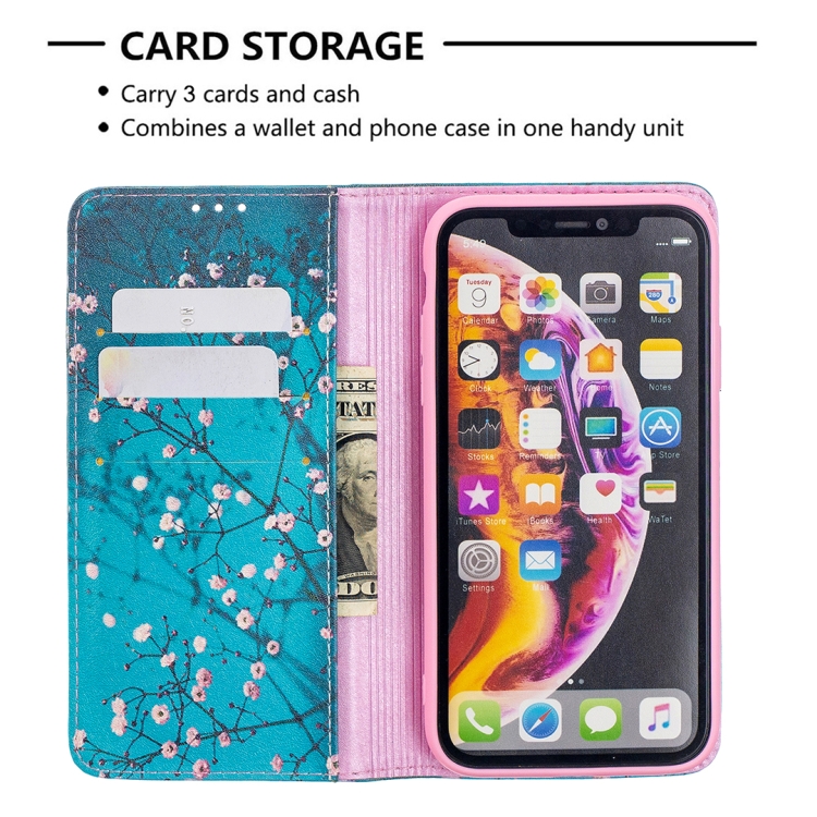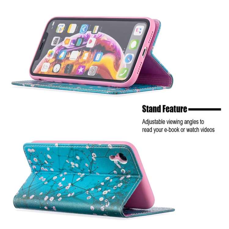Estuche de Cuero de Pu para iPhone Xr Patrón Dibujo a Color Tapa Horizontal Magnética Invisible Soporte Ranuras Tarjetas Billetera (Flor del Ciruelo)