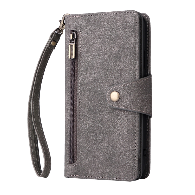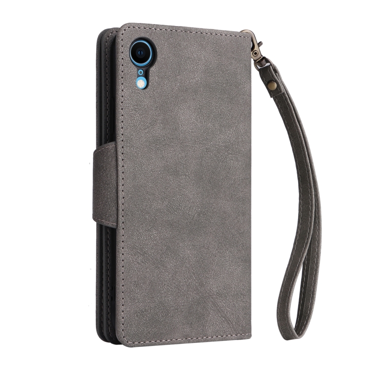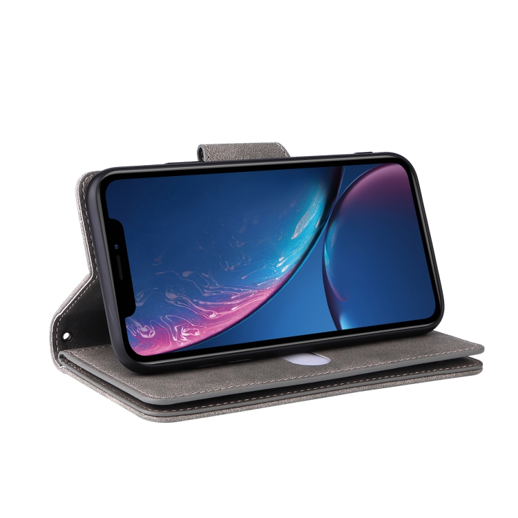 Funda de Cuero para iPhone Xr Rivet Buckle Tres Pliegues con 9 Tarjetas (Gris)