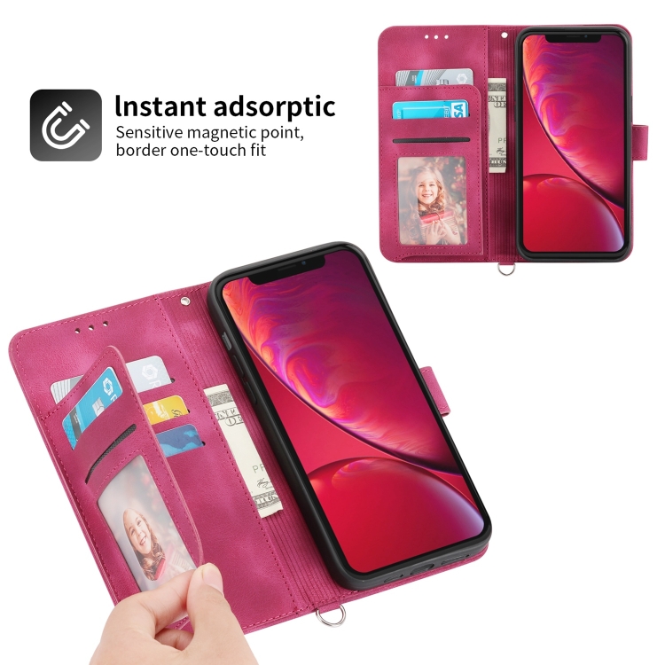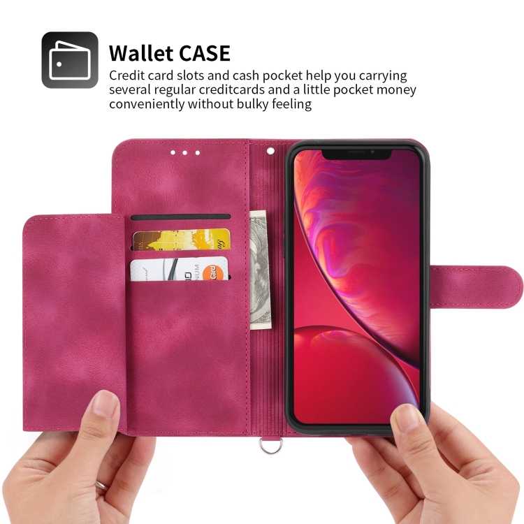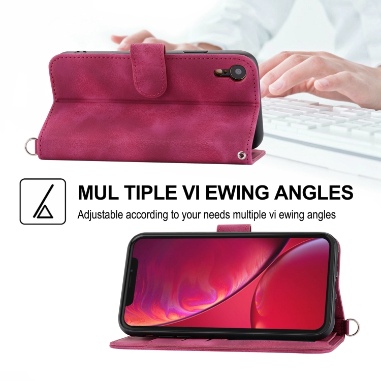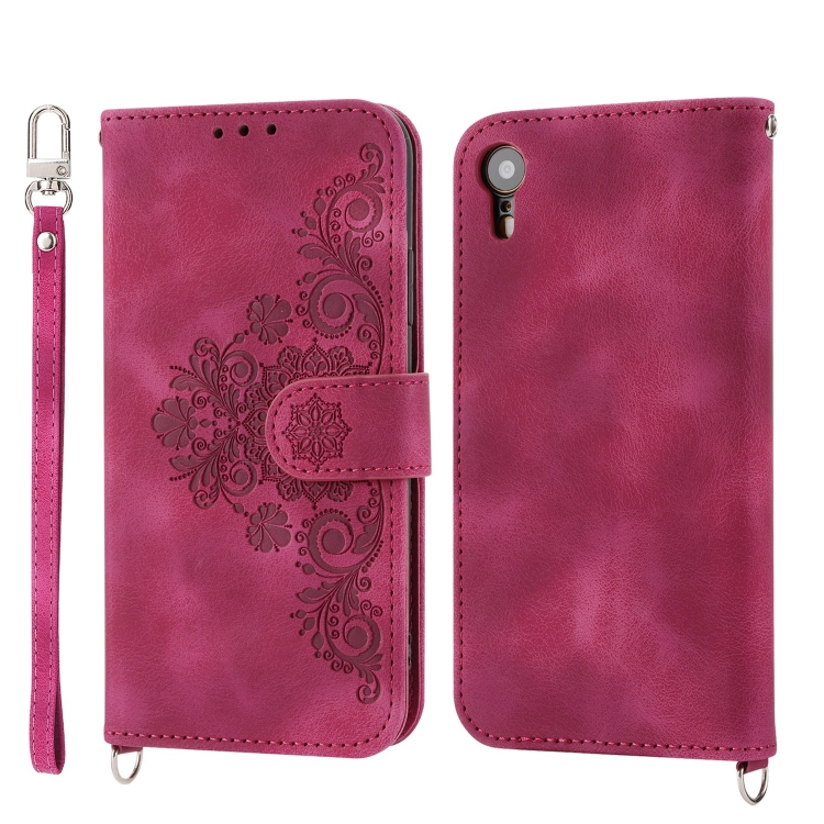 Funda de Cuero para iPhone Xr Skin-Feel Flowers con Billetera en Relieve (Rojo Vino)