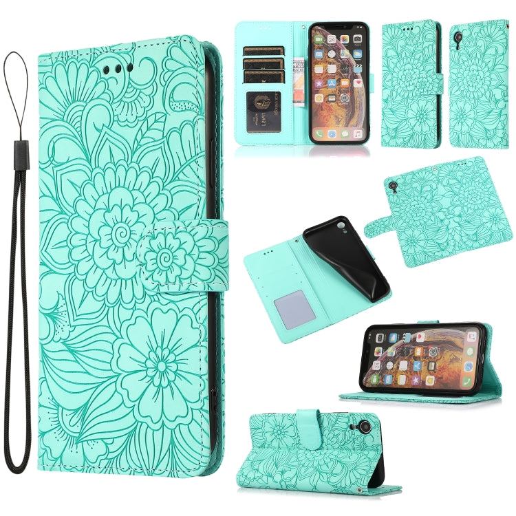 Funda de Cuero para iPhone Xr Skin Feel con Tapa Horizontal Girasol En Relieve Soporte Ranuras para Tarjetas Billetera y Cordón (Verde)