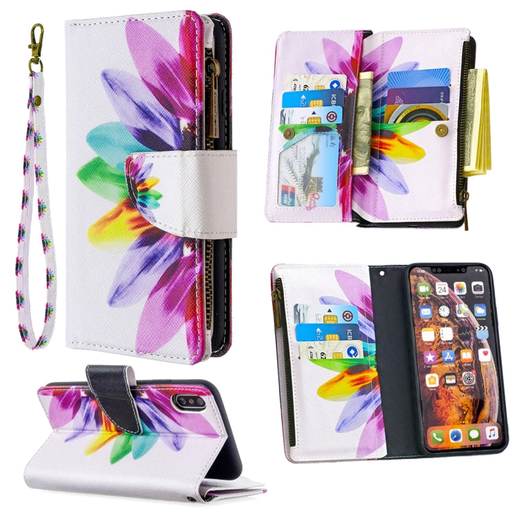 Funda de Cuero para iPhone Xs Max con Patrón de Dibujo, Cremallera, Tapa Horizontal, Soporte y Ranuras para Tarjetas (Flor del Sol)