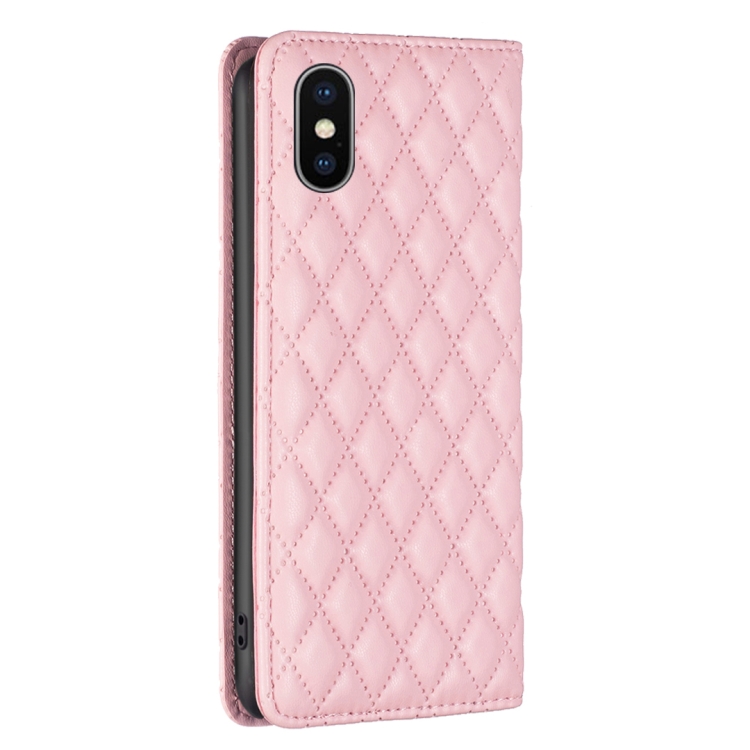 Funda de teléfono para iPhone Xs / X con tapa de cuero magnético Diamond Lattice (Rosa)