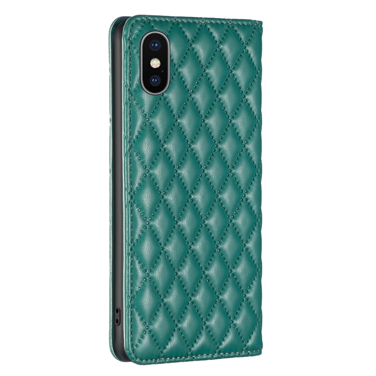 Funda de teléfono iPhone Xs X con tapa de cuero magnético Diamond Lattice (Verde)