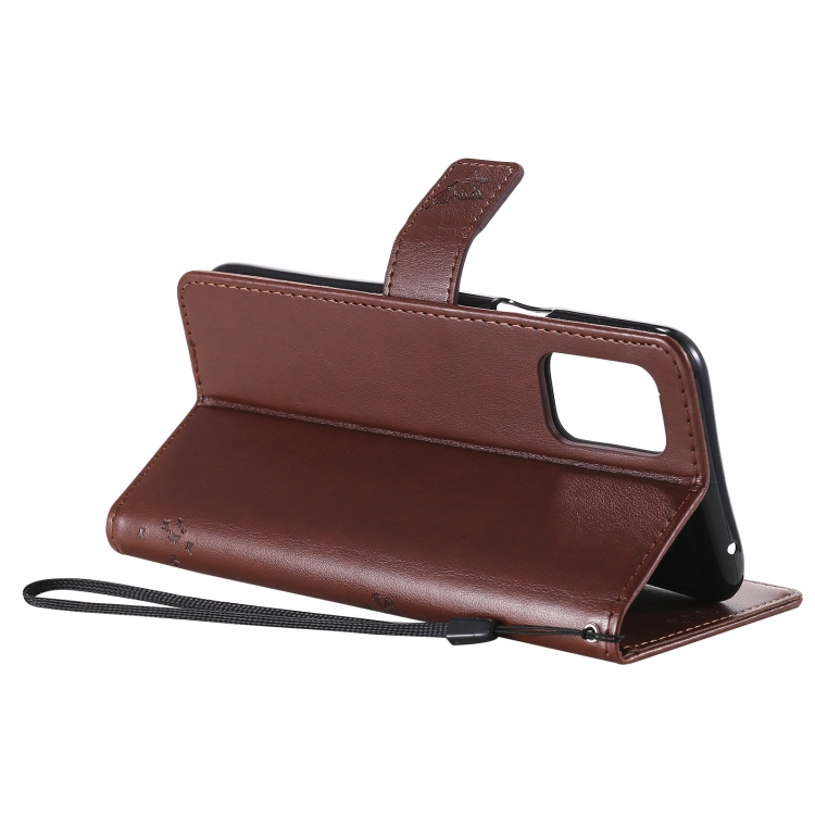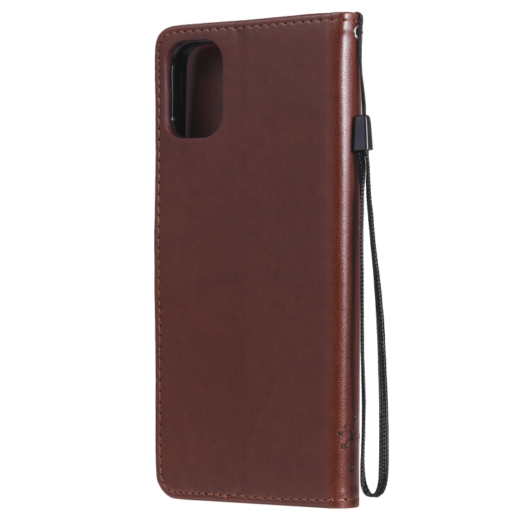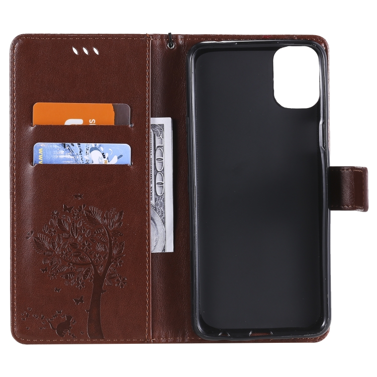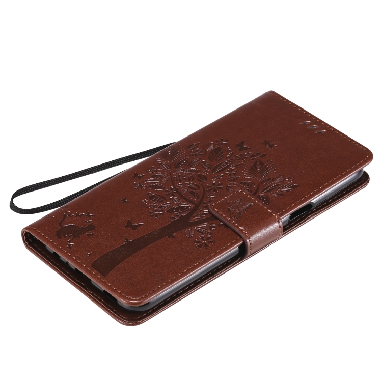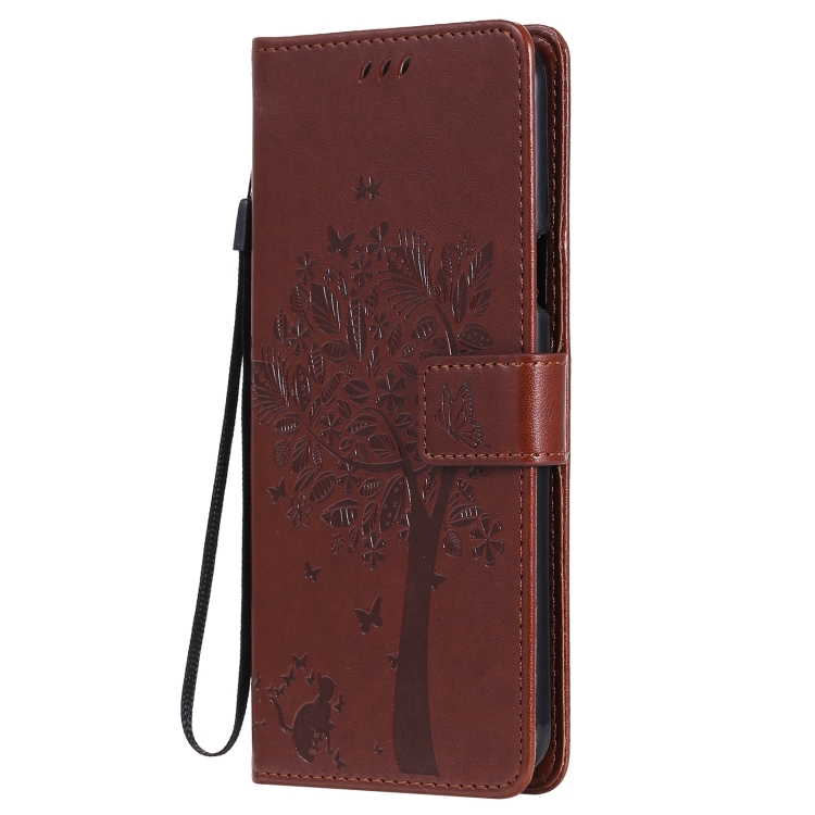 Funda Cuero Flip LG K42 Árbol y Gato Patrón con Soporte Tarjetero Billetera y Cordón (Café)