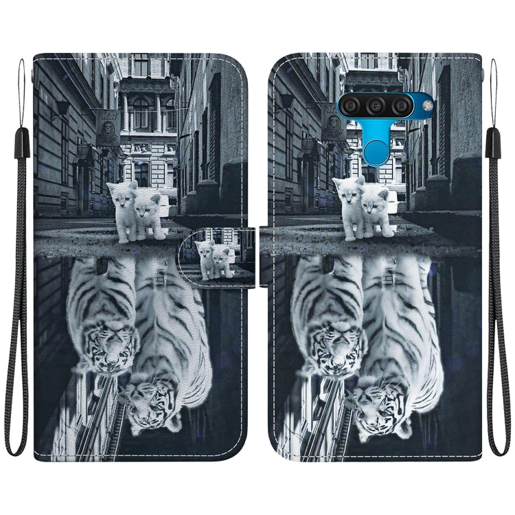 Funda para LG K50 / Q60 de Cuero con Dibujo Coloreado y Textura de Cristal (Reflejo de Tigre Gato)