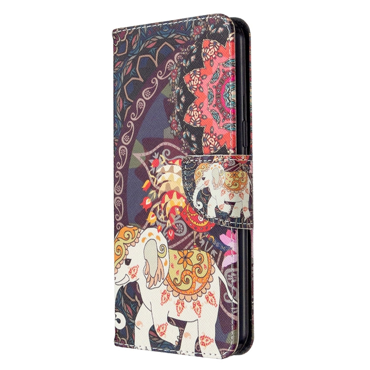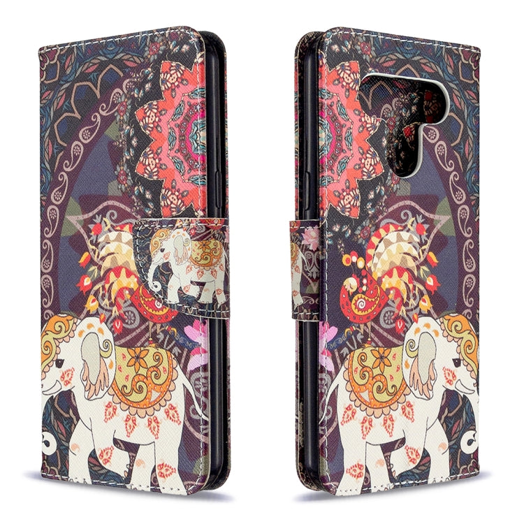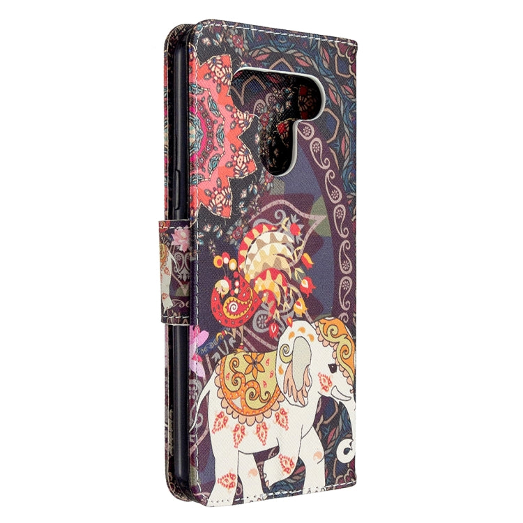 Estuche de Cuero Abatible Horizontal para LG K51 con Soporte, Ranuras para Tarjetas y Billetera (Flores y Elefante)