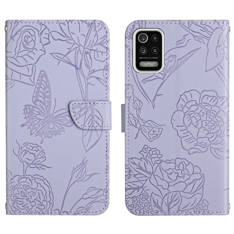 Funda para LG K52 Cuero en Relieve Peonía y Mariposa (Púrpura)