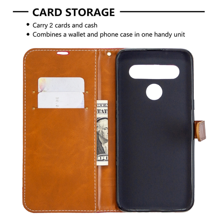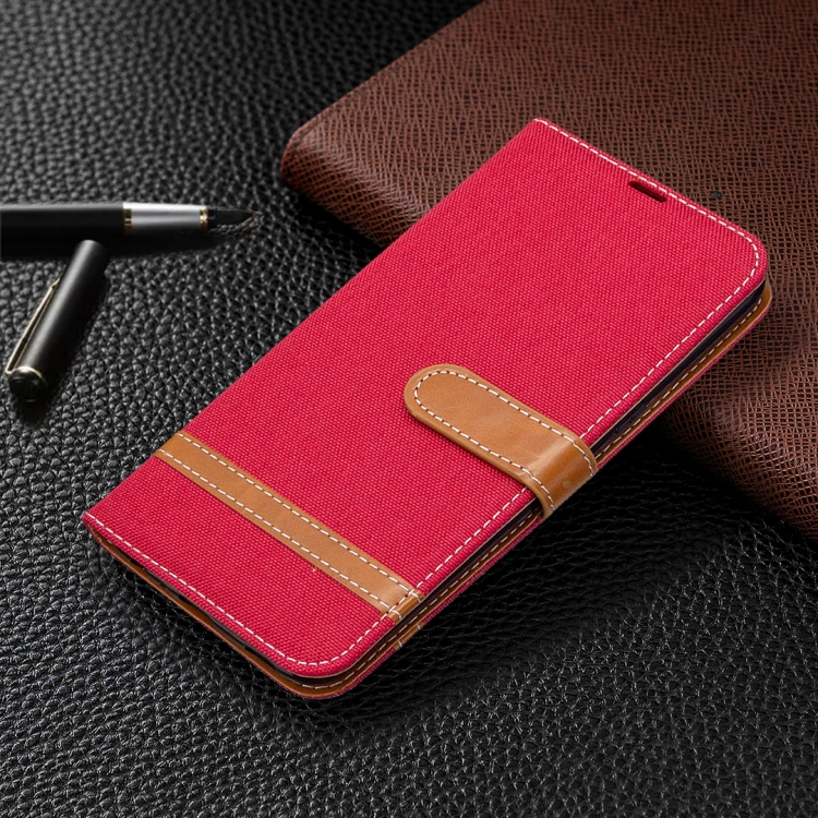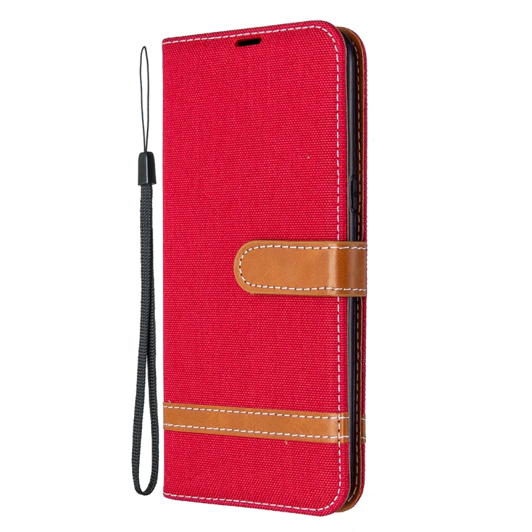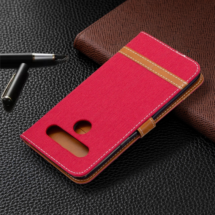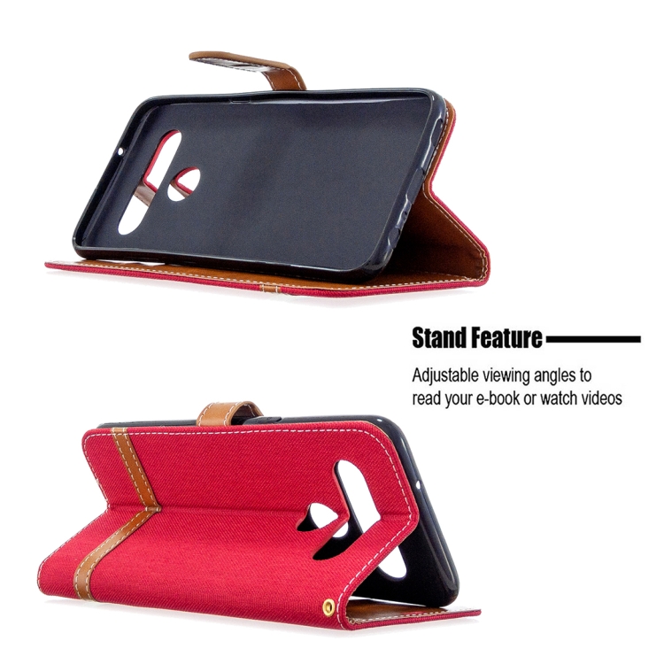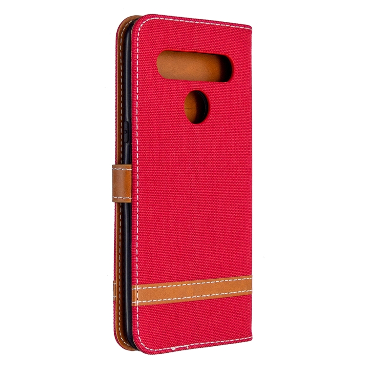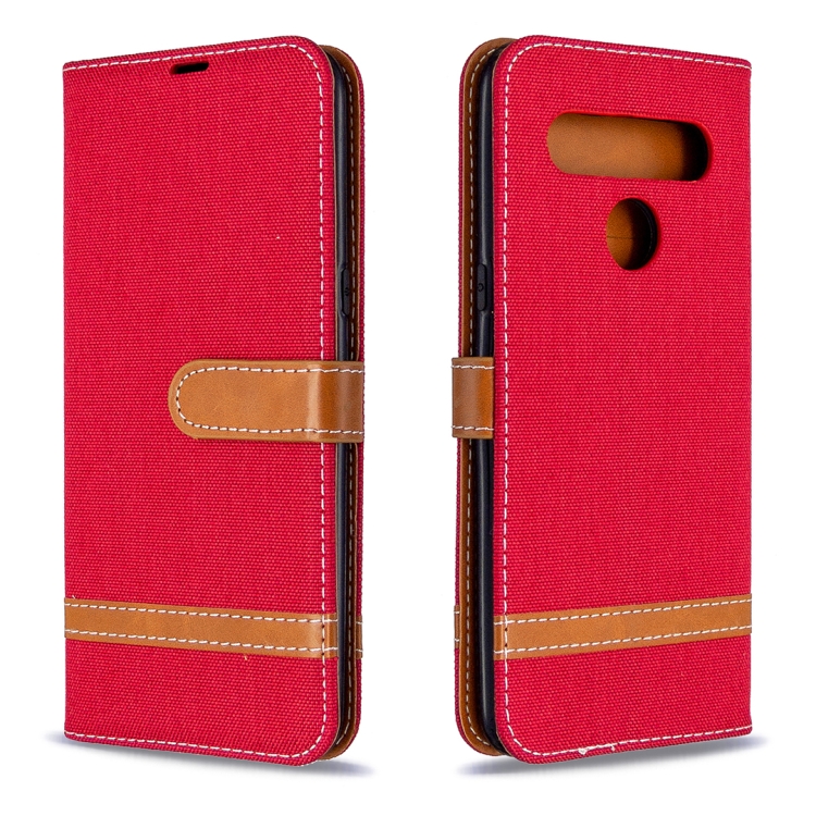 Funda de Cuero para LG K61 con Tapa Horizontal, Textura Mezclilla, Soporte, Ranuras y Cordón (Rojo)