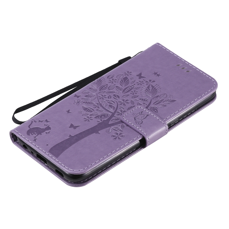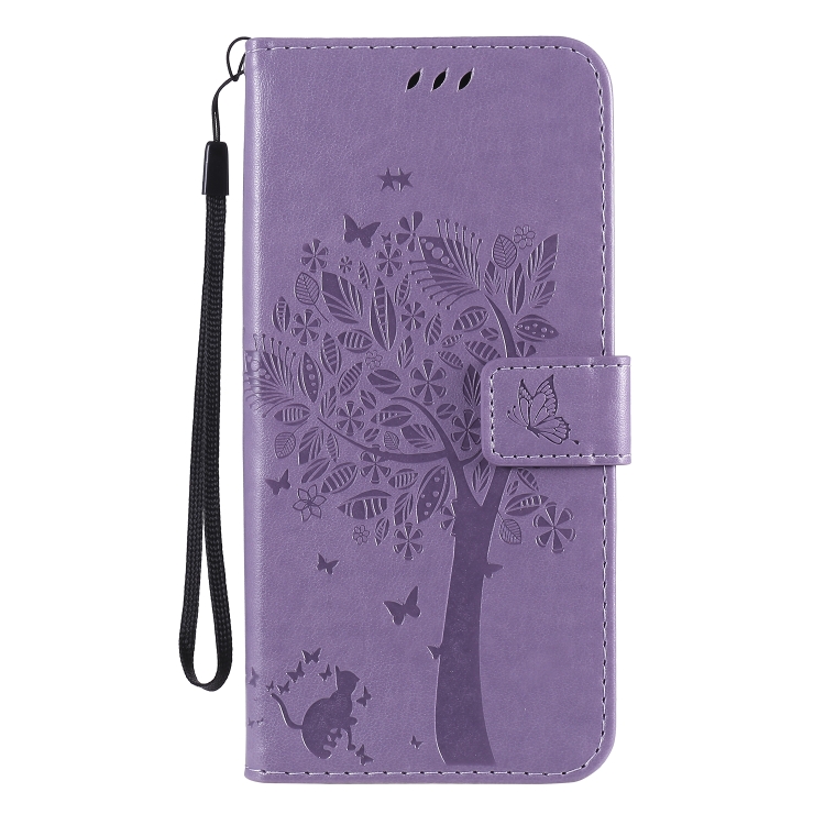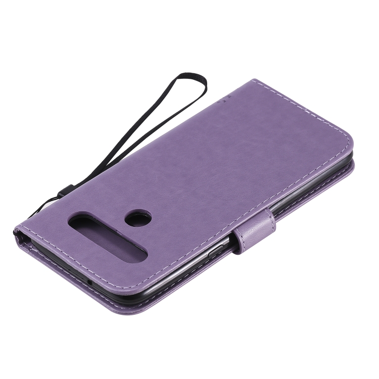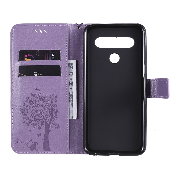 Funda de Cuero para LG K61 Tree & CAT con Tapa Horizontal, Soporte, Ranuras para Tarjetas y Cordón (Morado Claro)