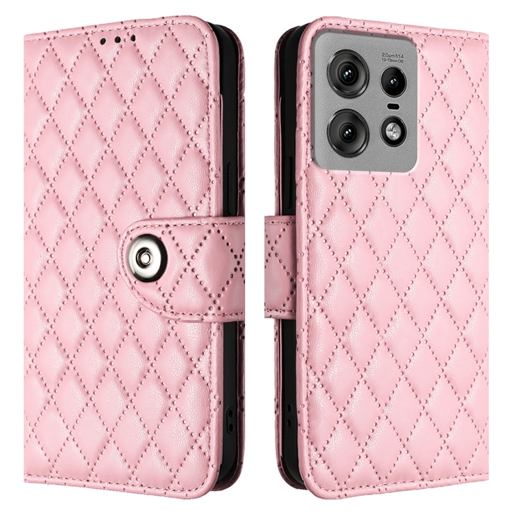 Funda de Cuero para Motorola Edge 50 Pro con Tapa Textura Rombal y Cordón (Rosa)