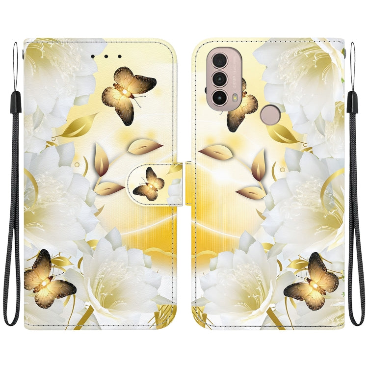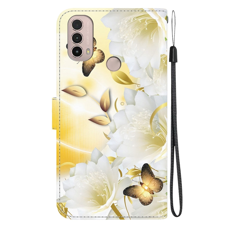Funda para Motorola Moto E20 E30 E40 de Cuero con Dibujo Epiphyllum Mariposa Dorada (Textura Cristal)