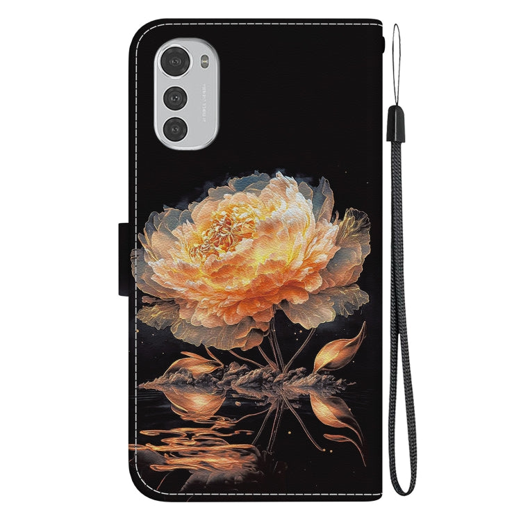 Estuche de Cuero para Motorola Moto E32 con Dibujo Coloreado y Textura de Cristal (Peonía Dorada)