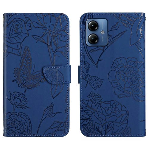• 1x Funda de Cuero para Motorola Moto G54 HT03 Skin Feel Butterfly con Tapa en Relieve (Azul)