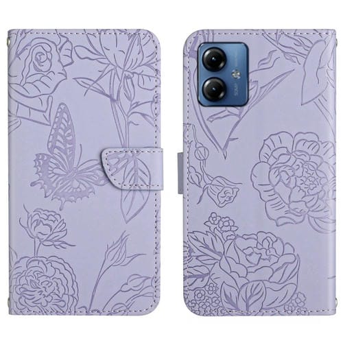 Funda de Cuero para Motorola Moto G54 Ht03 Skin Feel Butterfly con Tapa en Relieve (Púrpura)