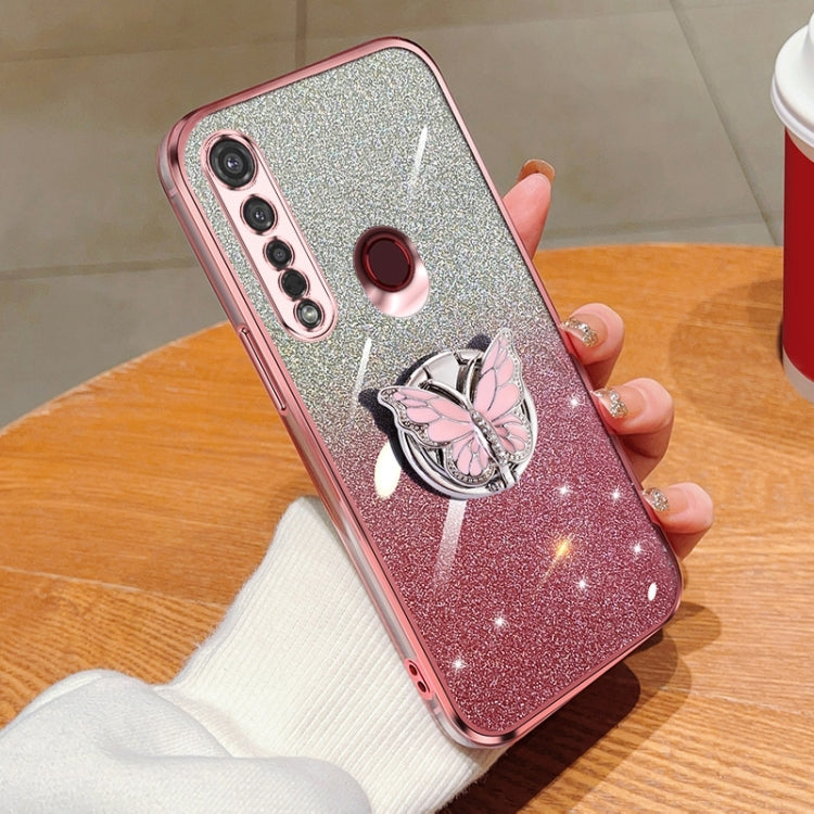 Funda TPU para Motorola Moto G8 Plus con Soporte de Mariposa y Brillo Degradado (Rosa)